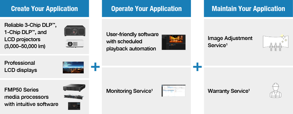 | 顛覆工作流程的自動校正功能 基於攝影機的自動校正技術,可自動完成畫面融合與黑階調整,在無需額外授權費用的情況下,即可大幅簡化現場施工作業流程,顯著提升整體效率。 | 完整生態系統.穩定可靠 FMP50 系列與 Panasonic 投影機無縫整合,打造高度一致且完整的系統生態系,不僅能大幅提升系統穩定性,也能在發生異常時實現快速故障排除與迅速復原,確保整體運作長時間穩定順暢。 |